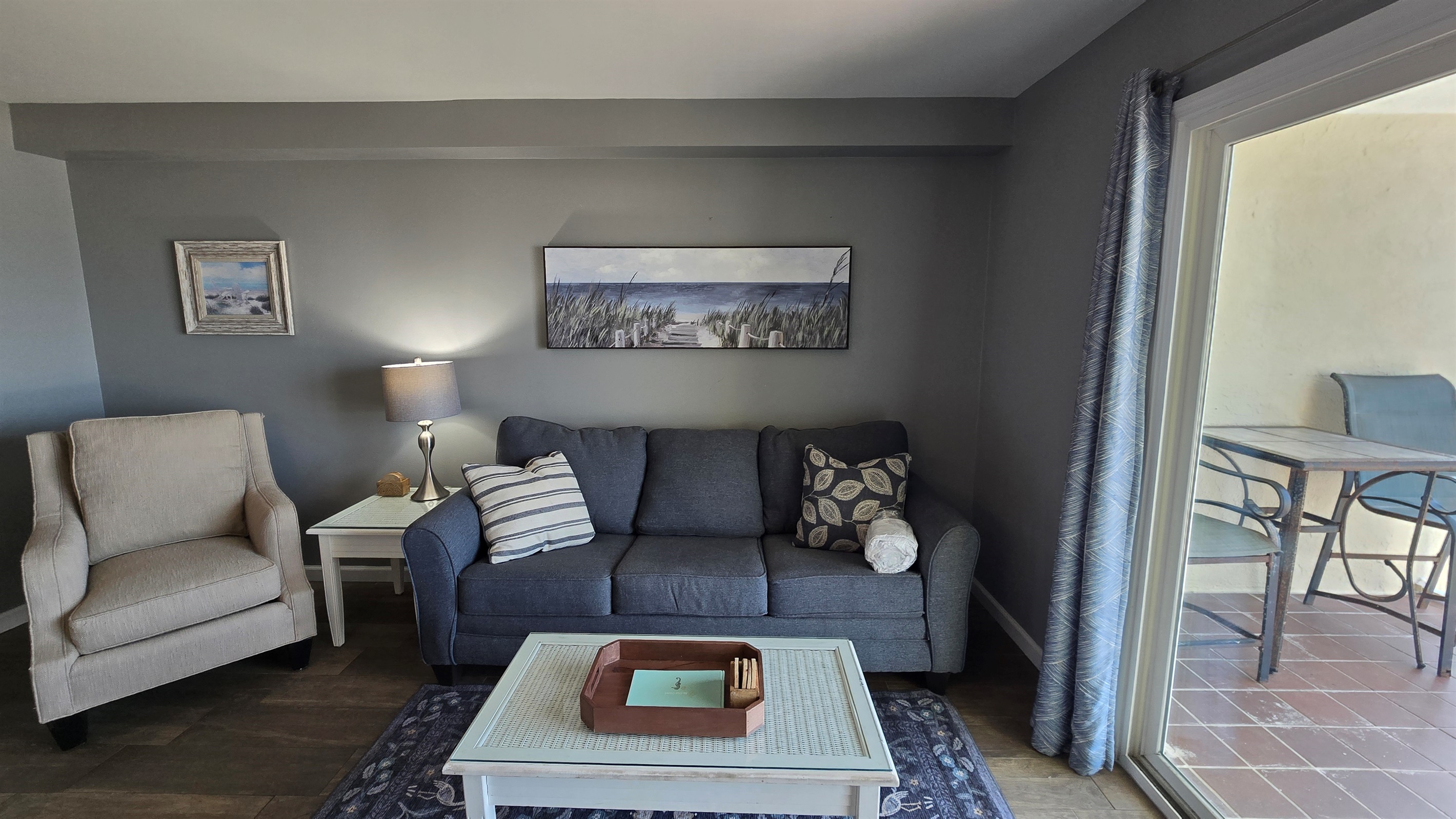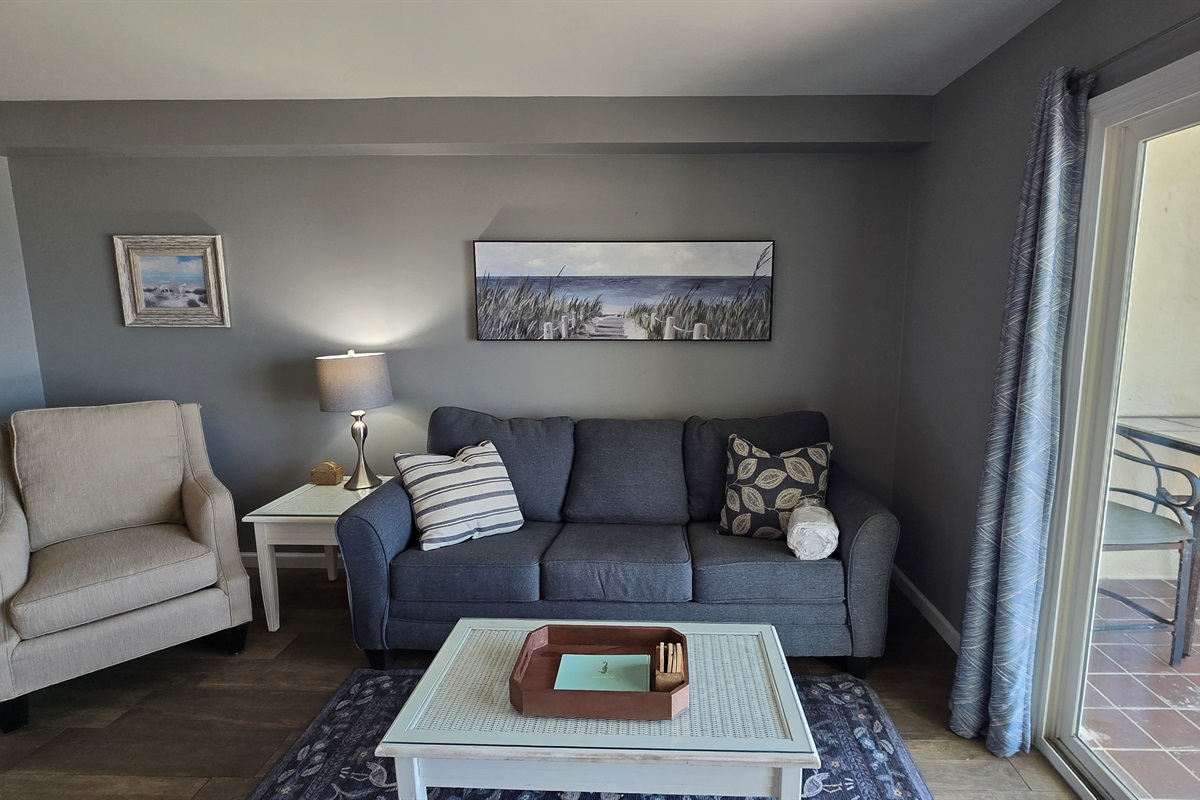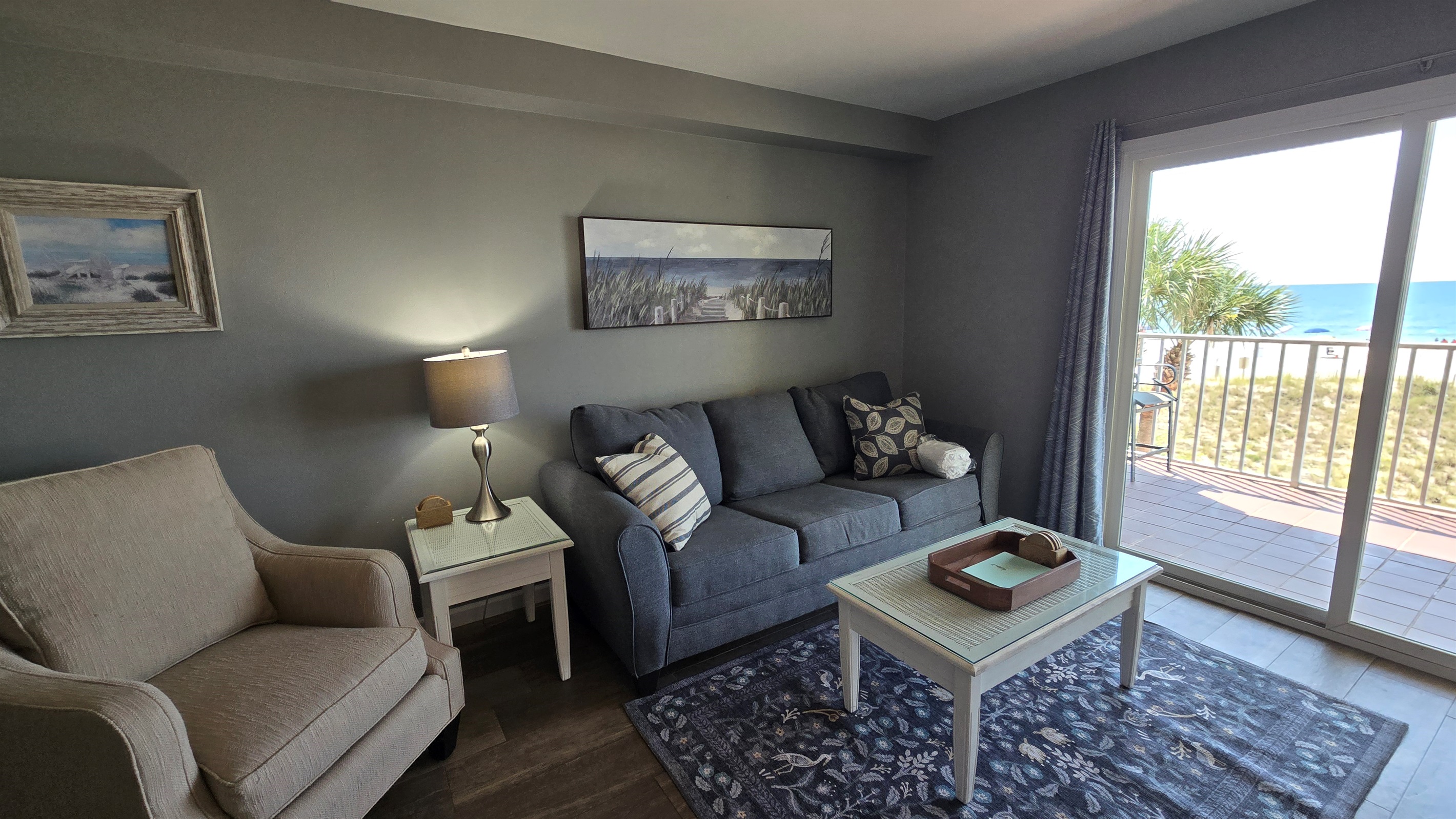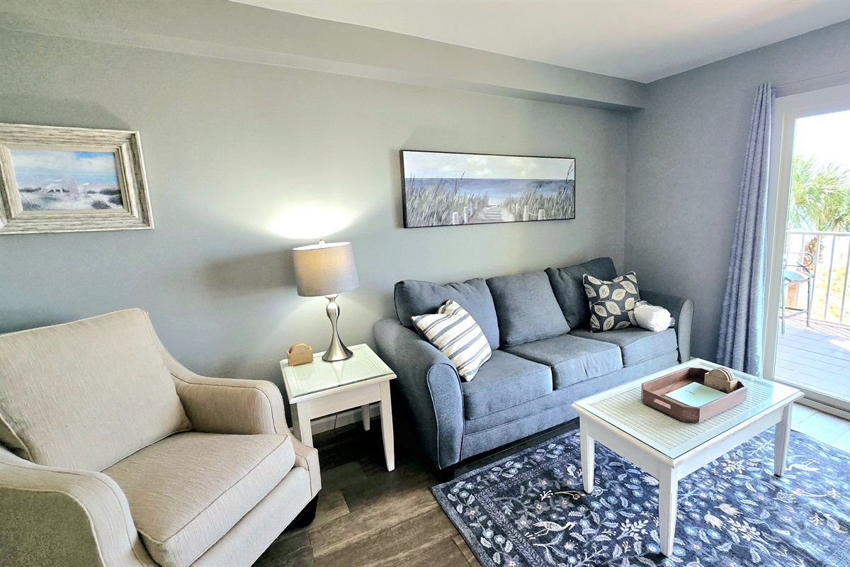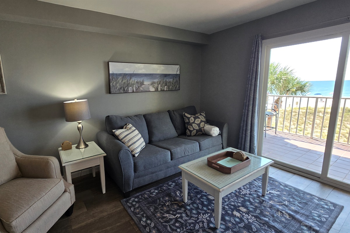 Step inside to a cozy yet stylish living area with plush seating, a large smart TV for movie nights, and sliding glass doors that open to your private balcony with *breathtaking, unobstructed views* of the Gulf.