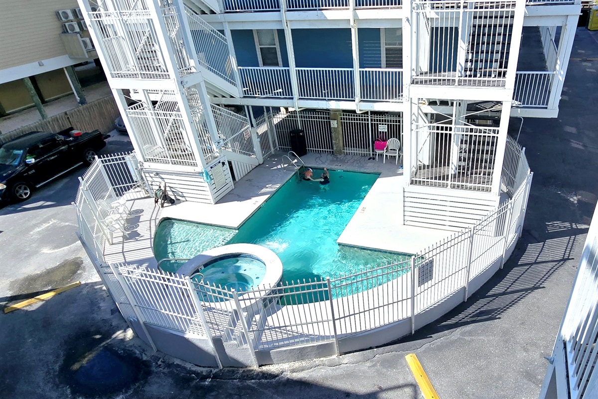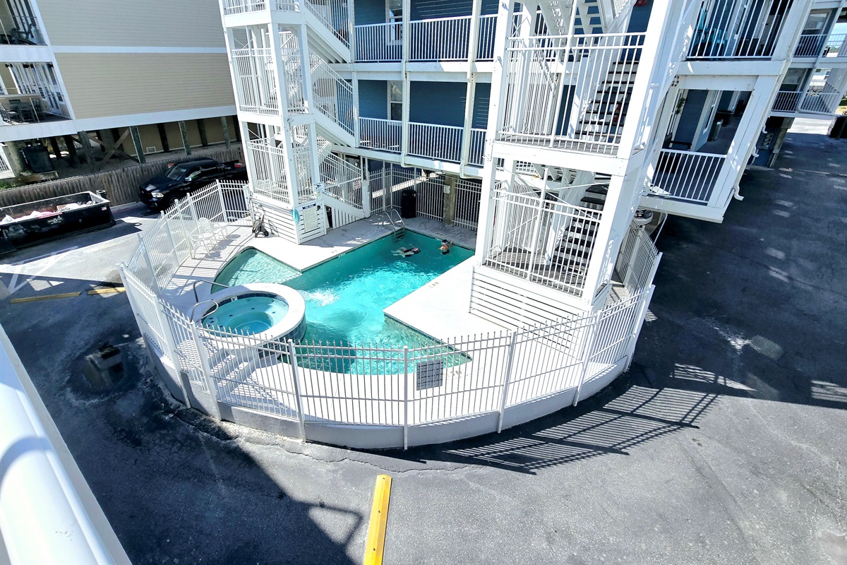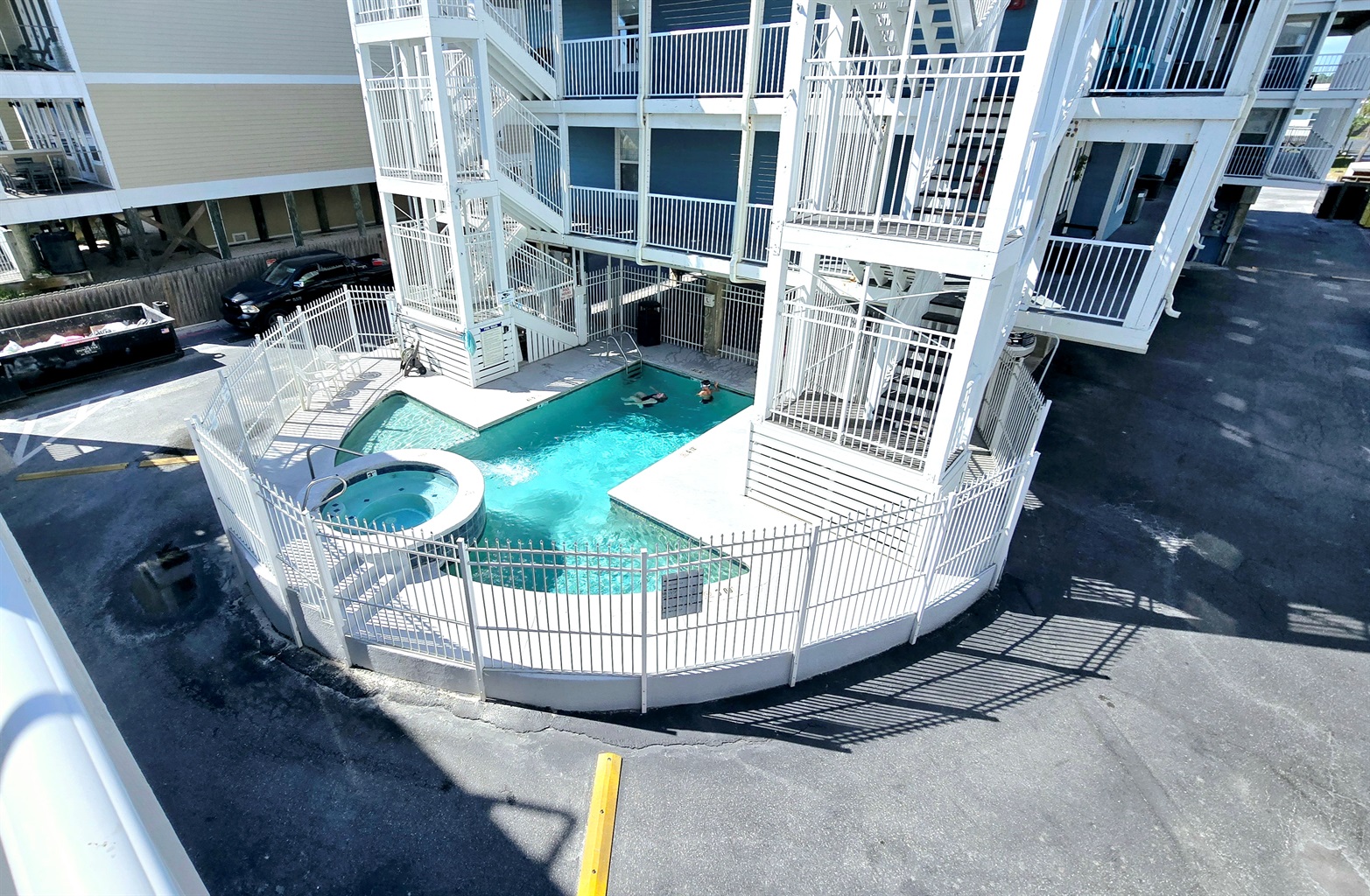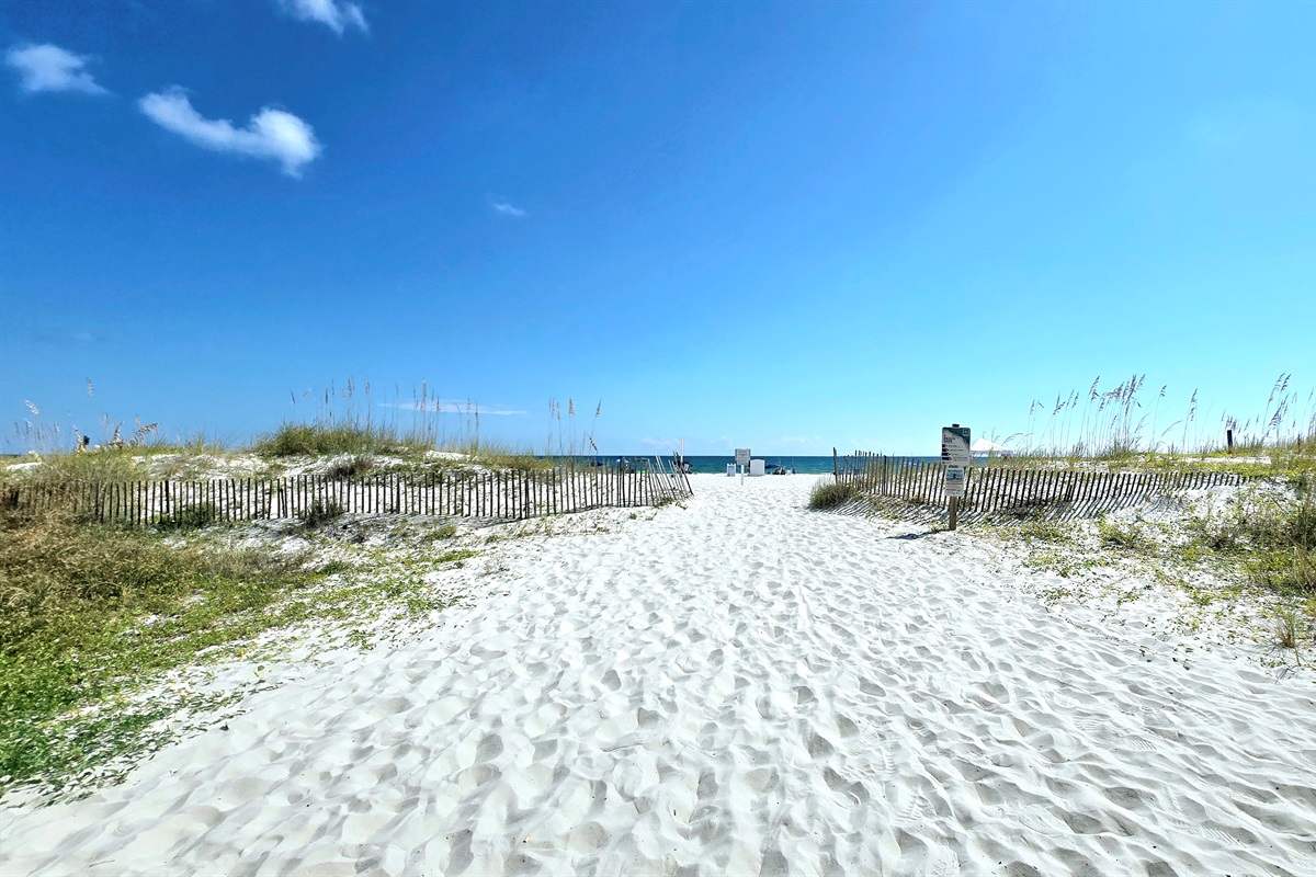 The pool includes a kiddie section connected to the main pool and a hot tub with a water feature flowing into the main pool. Enjoy a great light feature at night, with beautiful, relaxing changing colors. The pool is heated. The beach is literally just steps from your front door. Go down the two flights of stairs, walk past the pool, continue underneath the first building (next to the grilling area), and there you are! Toes in the sand :)